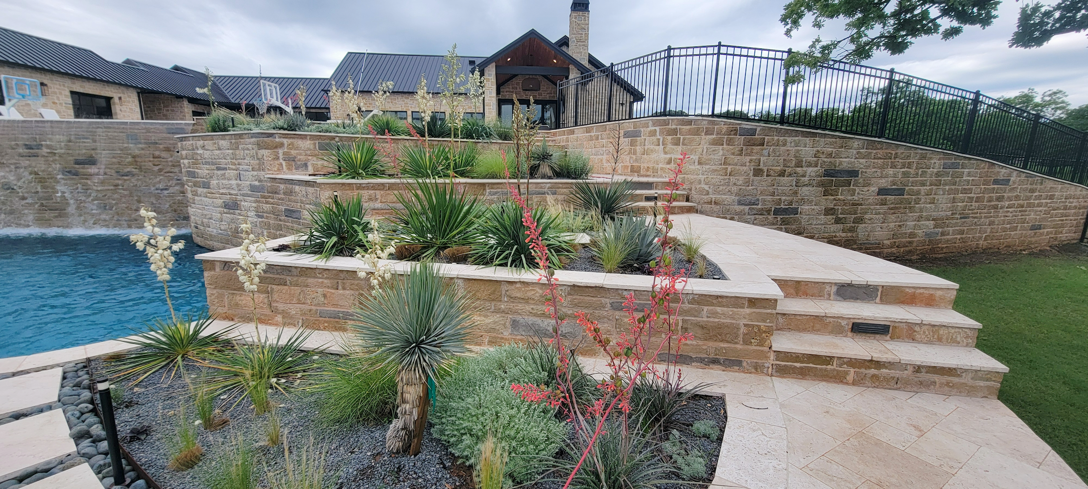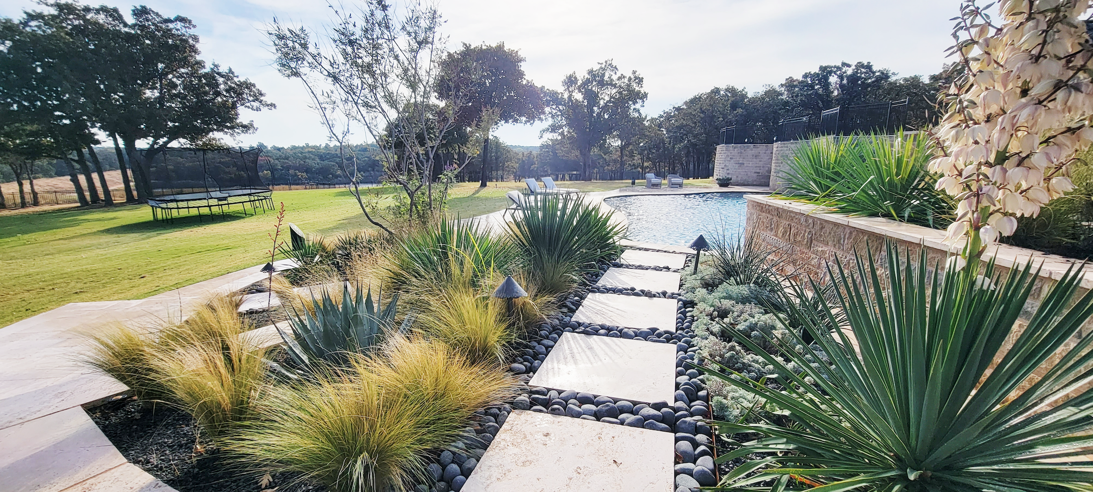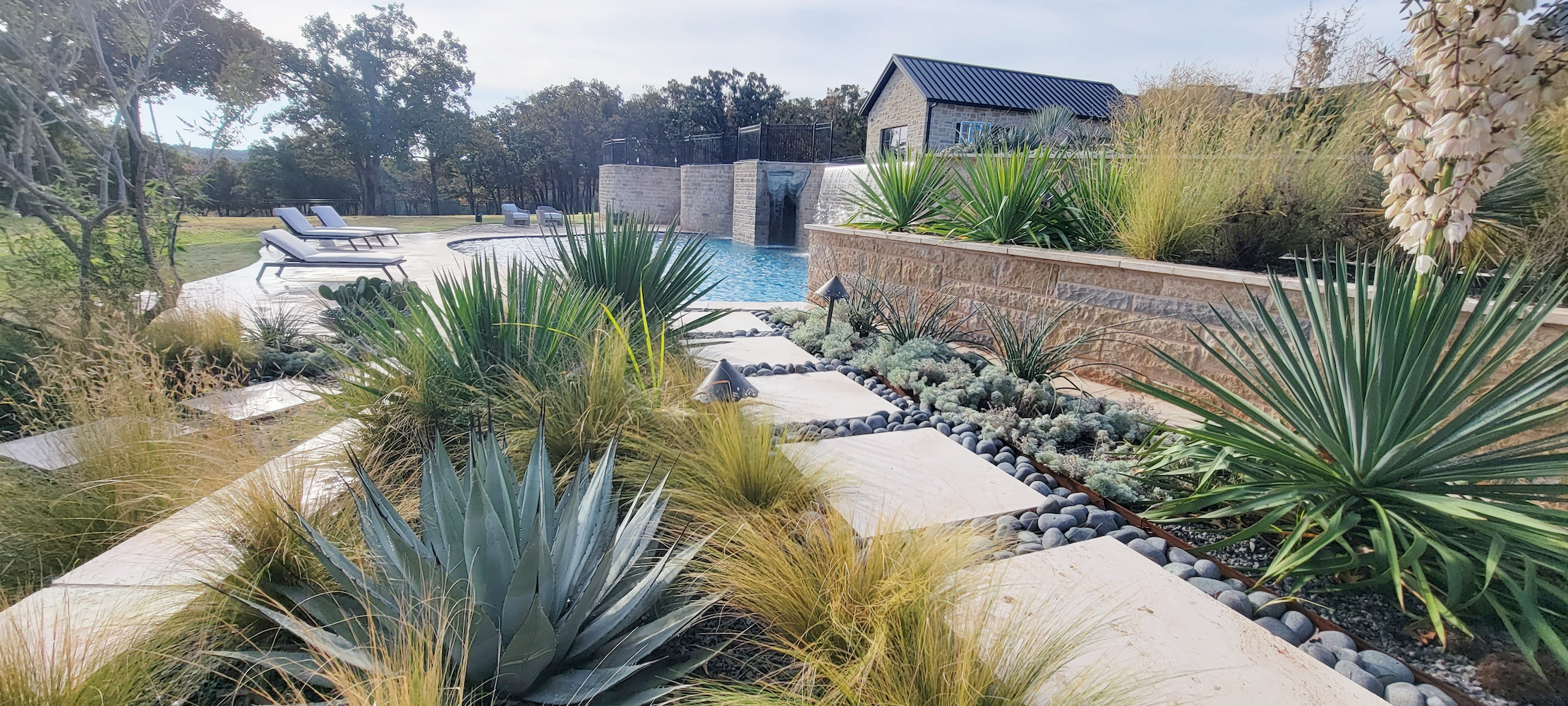 Located in Stillwater, Oklahoma, this landscape blends Central Texas charm with local sustainability. It features a resort-style pool framed by tiered limestone walls, managing the sloped terrain while adding depth. Native, drought-tolerant plants like yuccas, agaves, and ornamental grasses, accented by red yucca blooms, create a low-maintenance, textured look. Stone pavers with black pebble edging form a path, enhanced by strategic lighting. A sprawling lawn with mature oaks opens to views of the Oklahoma countryside, while the stone-and-metal-roofed home integrates seamlessly with a covered patio for outdoor living. This design balances luxury, functionality, and regional adaptation.
